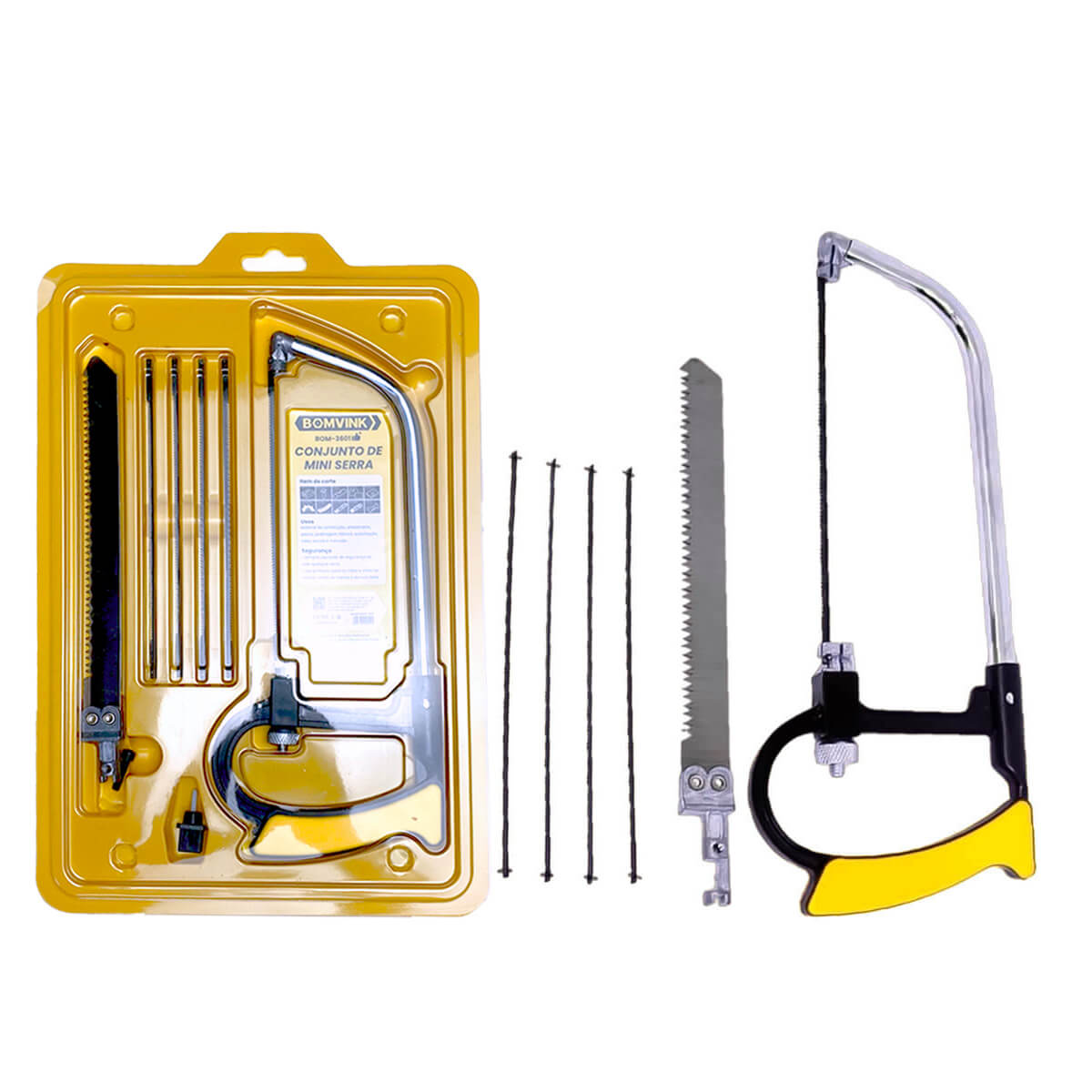 O Mini Arco de Serra 7 em 1 é uma ferramenta versátil e indispensável para trabalhos domésticos e pequenos projetos. Com um design compacto e funcional, permite cortes precisos em diversos materiais, como alumínio, madeira, tubos PVC e borracha. Este kit inclui cinco serras finas de aproximadamente 15 cm e uma serra grossa de 20 cm, além de um drill e um parafuso para facilitar a montagem e o uso. Todas as peças são armazenadas em uma embalagem organizadora, garantindo praticidade e transporte seguro.